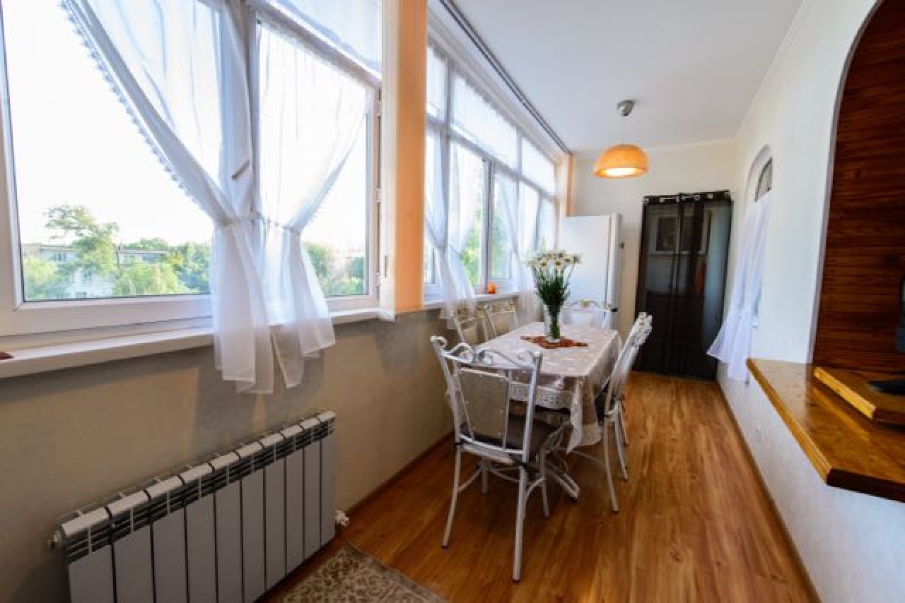 3-комнатная квартира расположена на 4 этаже, площадь — 68 м2. Светлая и просторная лоджия переоборудована в удобную столовую. В квартире произведен полный качественный ремонт, установлена новая современная кухня. Квартира укомплектована новой мебелью в классическим стиле, для каждой комнаты создан индивидуальный дизайн и решены вопросы эргономичности. Подключена необходимая бытовая техника: холодильник, морозильник, микроволновая печь, стиральная и сушильная машины, кондиционер, телевизор, утюг, пылесос, домашний телефон и Wi-Fi.