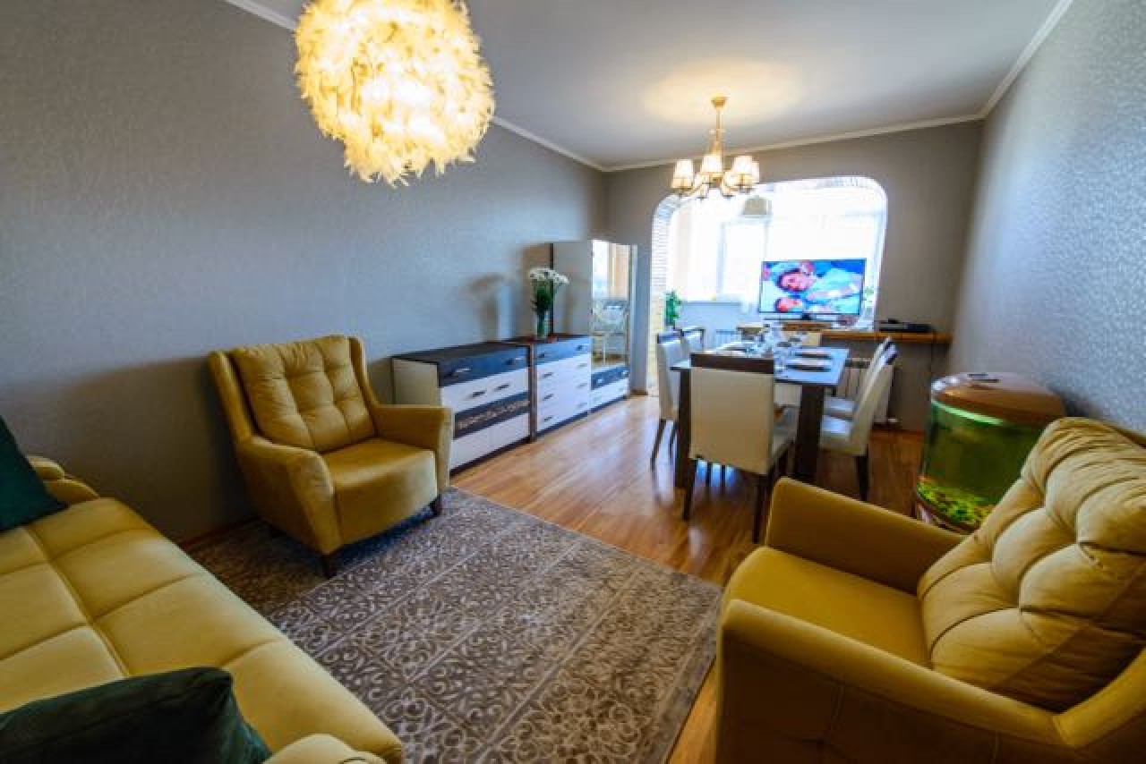 Квартира расположена в центре города, в окружении городских парков. Напротив дома – стадион «Динамо», этнопарк «Кен-Баба», рядом Центральный парк, ТРЦ «Mega Planet», супермаркет «Имран», рестораны «Камшат» и «Моцарелла», городской бассейн. Это один из самых удобных и зеленых районов Шымкента, в шаговой доступности расположены детские сады и школы, аптеки, поликлиника, банки.