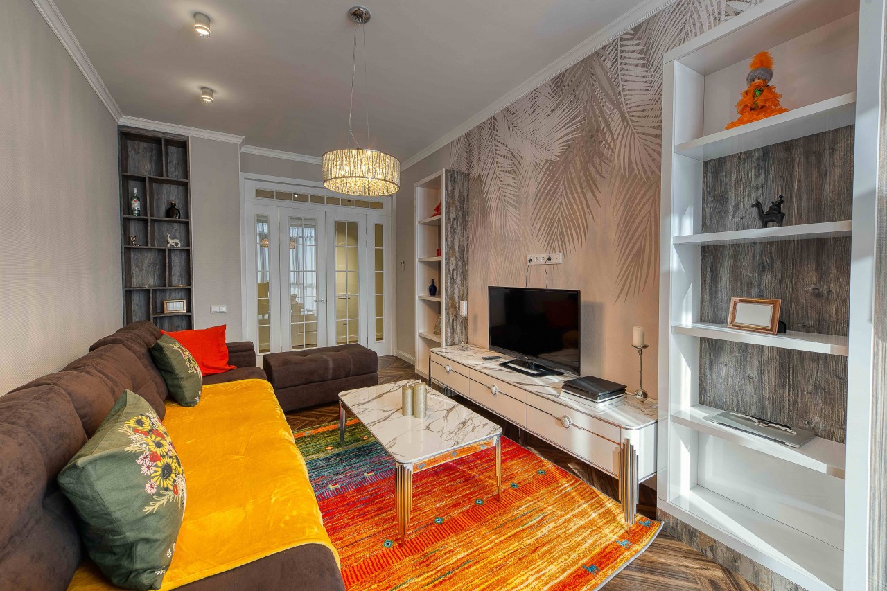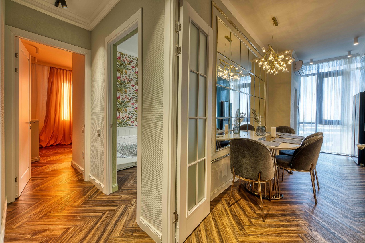 Шикарные и комфортные апартаменты находятся на 11-м этаже. Площадь квартиры — 88 м2, высота потолков — 3 метра. Уникальная планировка дает ощущение невероятного солнечного простора, предлагая каждому члену семьи достаточную конфиденциальность и максимальное ощущение жизни. Здесь произведен высококачественный ремонт с использованием современных технологий и материалов от известных мировых производителей. Полы в гостиной и спальнях застелены качественным паркетом. Квартира обставлена красивой мебелью в классическом современном стиле. Светлые, со вкусом меблированные спальни обеспечивают максимальный комфорт. Изюминка квартиры — уютная гостиная с качественными удобными креслами, диваном и телевизором с большим плоским экраном. Модная кухня с обеденной зоной и застеклённым балконом полностью оборудована и обслуживает все повседневные потребности: от стеклокерамической печи, микроволновой печи с грилем до посудомоечной машины и кофеварки. Имеется два санузла, на площадке — кладовка для хранения вещей. Есть собственная парковка в подземном гараже, стоимость которой включена в цену аренды.