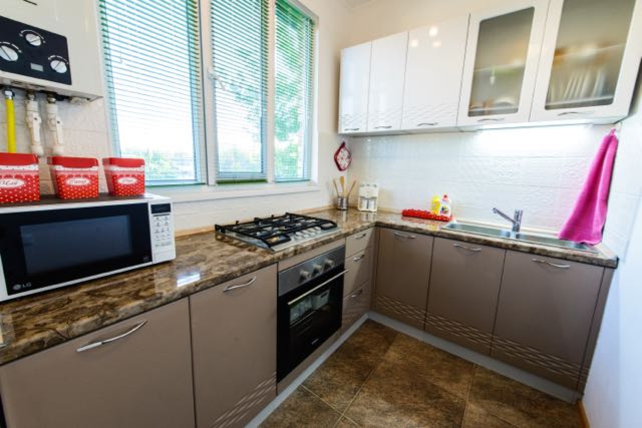 Пәтер қаланың орталығында орналасқан, оны саябақтар қоршап тұр. Үйге қарама-қарсы «Динамо» стадионы, «Кең баба» этносаябағы, Орталық саябақ, «Mega Planet» ОСО, «Имран» супермаркеті, «Кәмшат» және «Моцарелла» мейрамханалары және қала бассейні бар. Бұл қаланың ең жайлы әрі көгалдандырылған аудандарының бірі. Бірнеше қадам жүрсеңіз бала-бақшалар мен мектептер, дәріханалар, емханалар мен банктерге жаяу-ақ жетесіз.