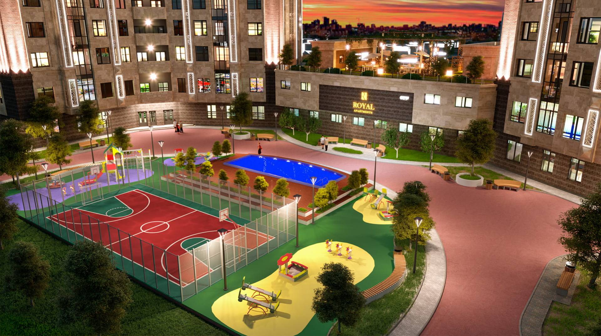 «Royal Apartments» — элитный жилой комплекс, новостройка класса премиум, где функциональность сочетается с изысканностью. Апартаменты комплекса обеспечены всей необходимой инфраструктурой: подземная автостоянка, ресторан, бутиковая зона, приватные озелененные дворики, спортивные площадки. Есть большой зеленый двор с детской площадкой, бассейном и уголками для отдыха. Территория комплекса закрыта, в лобби круглосуточно находится консьерж. Безопасность жителей дома гарантирует круглосуточная частная охрана и система видеонаблюдения.
