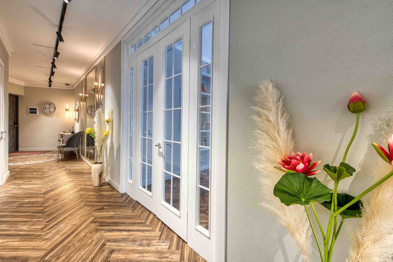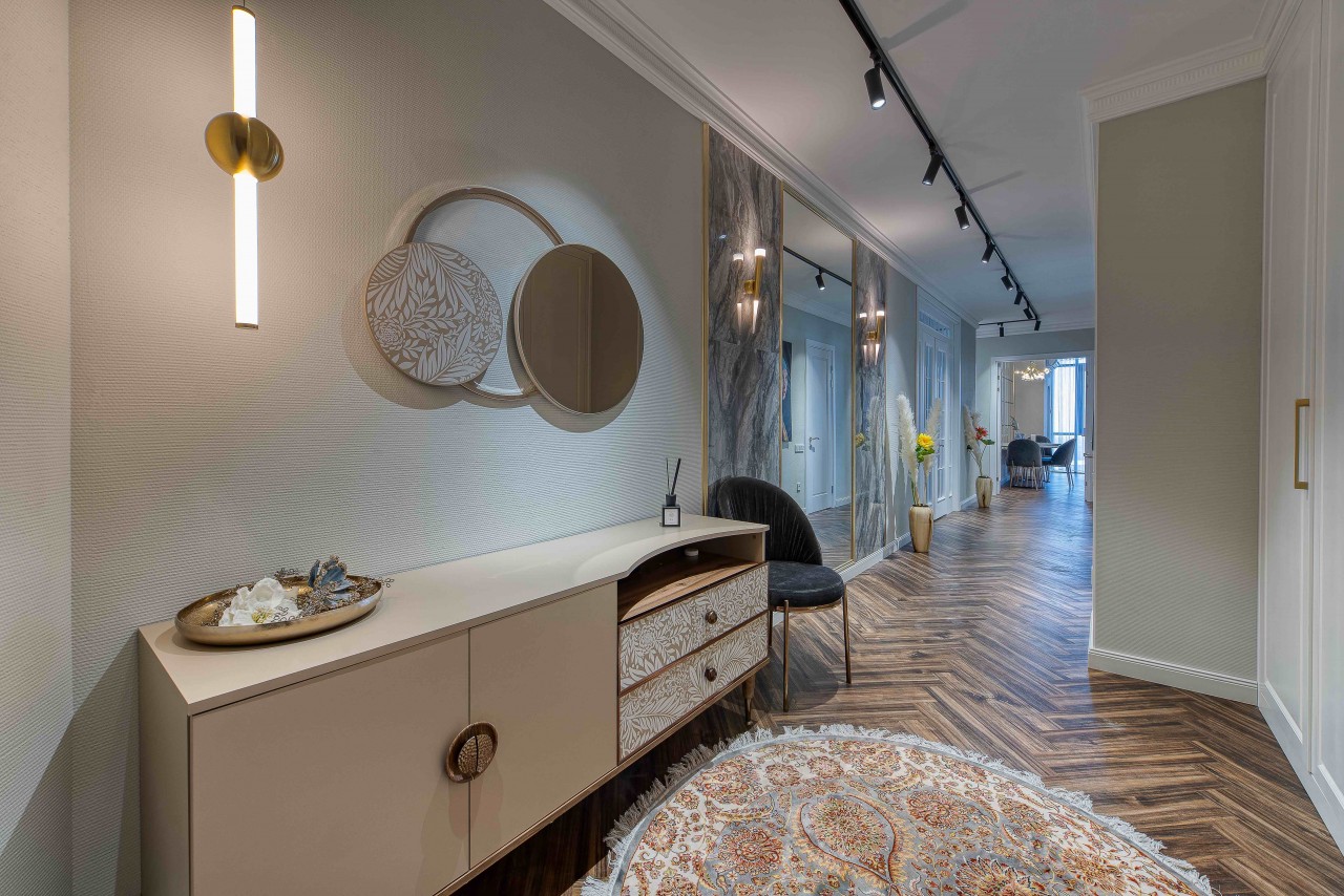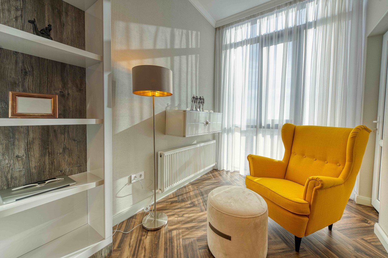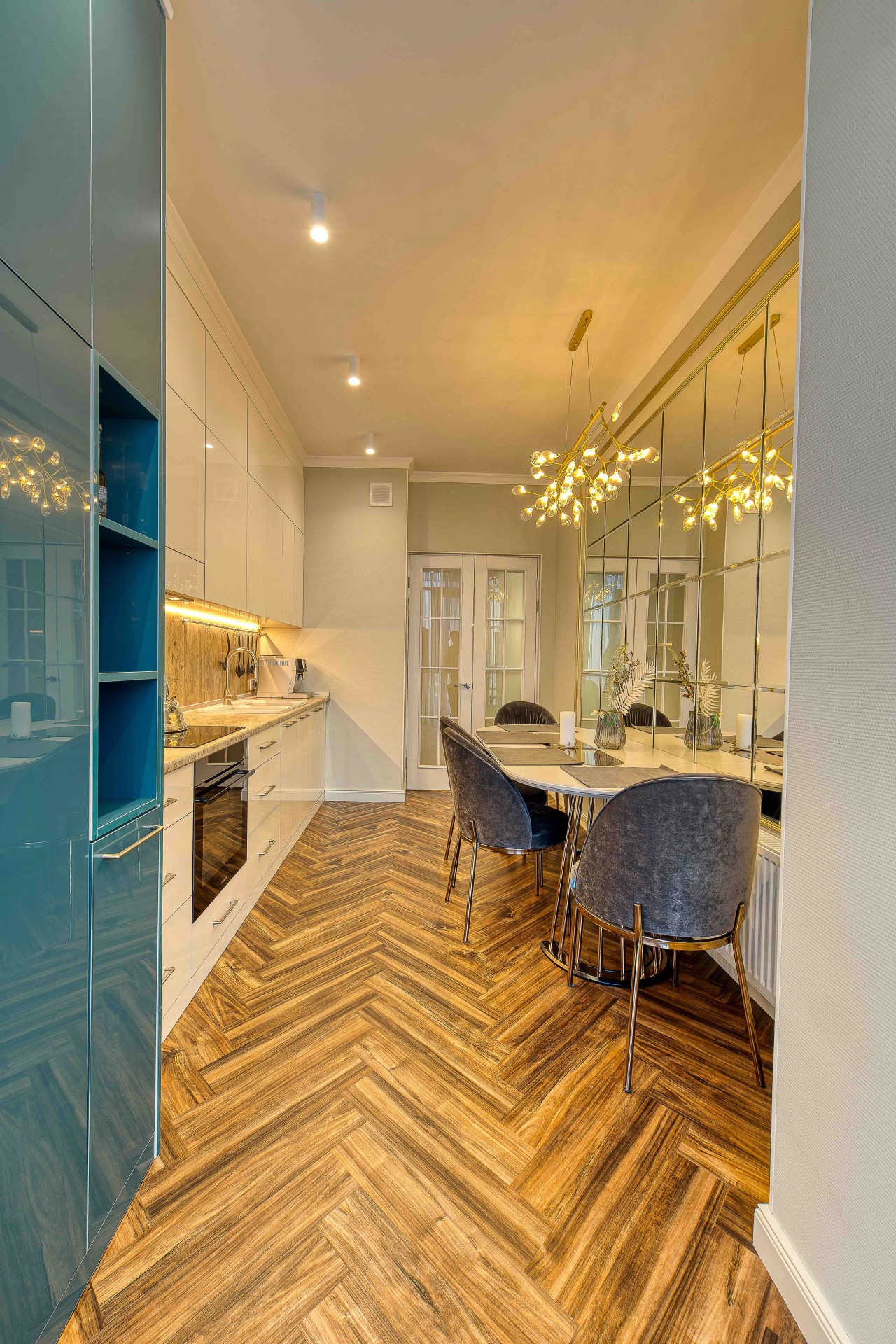 Шикарные и комфортные апартаменты находятся на 11-м этаже. Площадь квартиры — 88 м2, высота потолков — 3 метра. Уникальная планировка дает ощущение невероятного солнечного простора, предлагая каждому члену семьи достаточную конфиденциальность и максимальное ощущение жизни. Здесь произведен высококачественный ремонт с использованием современных технологий и материалов от известных мировых производителей. Полы в гостиной и спальнях застелены качественным паркетом. Квартира обставлена красивой мебелью в классическом современном стиле. Светлые, со вкусом меблированные спальни обеспечивают максимальный комфорт. Изюминка квартиры — уютная гостиная с качественными удобными креслами, диваном и телевизором с большим плоским экраном. Модная кухня с обеденной зоной и застеклённым балконом полностью оборудована и обслуживает все повседневные потребности: от стеклокерамической печи, микроволновой печи с грилем до посудомоечной машины и кофеварки. Имеется два санузла, на площадке — кладовка для хранения вещей. Есть собственная парковка в подземном гараже, стоимость которой включена в цену аренды.